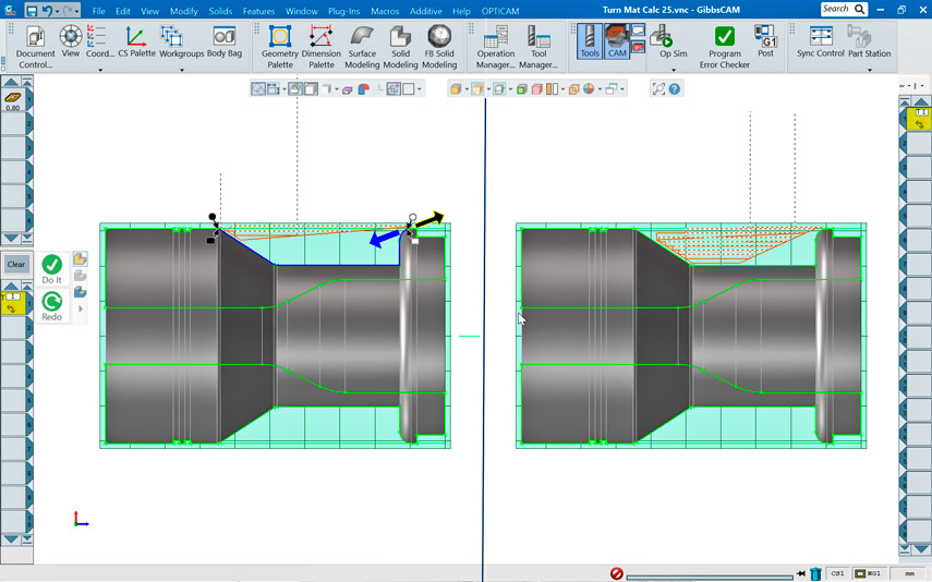 GibbsCAM 2026 sisältää lukuisia uusia käytettävyyden ja simuloinnin parannuksia, jotka virtaviivaistavat ohjelmointia ja parantavat työnkulun selkeyttä. Käyttäjät voivat nyt skaalata solideja, pintoja ja FacetBodyja tarkasti, kiertää geometriaa tasosta poikkeavaan asentoon ilman monimutkaisia kiertoliikkeitä ja mitata pienimmät ja suurimmat etäisyydet parannettua osien tarkastusta varten. Materiaalimäärittelyt ovat tarkempia, kiitos parannusten kuten cylindrical Shrink Wrapin, ja Undo/Redo-historian navigointi tarjoaa nopean pääsyn mihin tahansa suunnitteluprosessin vaiheeseen. Simuloinnin toisto heijastaa todellista koneistusaikaa ja sisältää metallisen renderoinnin vaihtoehtoja paremman visuaalisen selkeyden saavuttamiseksi. Näiden parannusten myötä GibbsCAM 2026 on nopeampi, intuitiivisempi ja luotettavampi monimutkaisissa koneistustehtävissä.