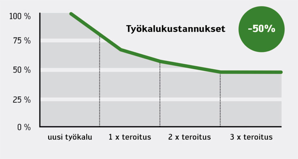 Työkalujen teroitus on usein huomattavasti edullisempi vaihtoehto kuin uuden työkalun hankinta. Koska kovametallin osuus työkalun valmistuskustannuksista on merkittävä, saman rungon uudelleenkäyttö tuo selviä säästöjä erityisesti tilanteessa, jossa raaka-aineiden hinnat ovat nousussa. Systemaattinen teroituskierto vähentää uusien työkalujen hankintatarvetta ja auttaa pitämään työkalukustannukset paremmin hallinnassa. Kun käytössä on selkeä prosessi, jossa kuluneet työkalut kerätään, huolletaan ja palautetaan takaisin tuotantoon, työkalujen käyttöikä pitenee ja varaston hallinta helpottuu. Samalla pienenee myös materiaalihukka, sillä kovametalli pysyy käytössä pidempään ennen kuin työkalu poistetaan kierrosta.