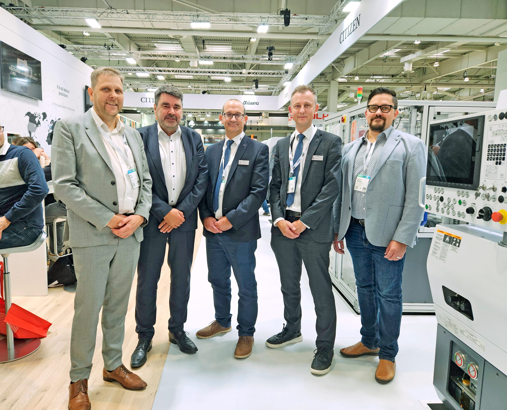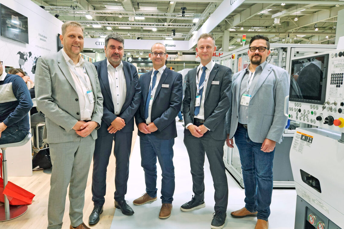 Kuva: Tapaaminen EMO-messuilla Citizen Machinery UK:n edustajien Craig Geesonin (COO) ja Jon Hartin (CEO) kanssa. Kuvassa MTC Flextekiltä Tomi Tiitola, Vesa Viitala ja Sampsa Mäkinen.