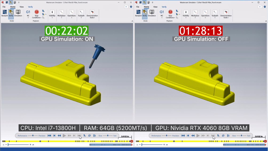 Teknisesti suurin yksittäinen uudistus Mastercam 2026.R2:ssa on Verify-tarkastuksen nopeutuminen näytönohjaimen laskentatehon avulla. Aiemmin tarkastus on perustunut lähes kokonaan suorittimen laskentanopeuteen, mikä on tehnyt erityisesti suurten ja moniakselisten ohjelmien tarkastamisesta hidasta.