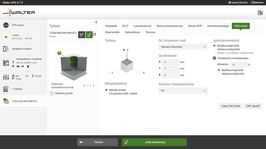 Walter GPS löytyy helpoimmin Camcutin verkkosivujen vasemmasta alakulmasta vihreää Find-painiketta klikkaamalla. Kun sopiva työkalu on valittu, suositukset voidaan lisätä suoraan Camcutin verkkokaupan ostoskoriin, josta näkyy tuotteiden varastosaatavuus. Samalla voi ladata yksityiskohtaisen 3D-mallin tarkempaa tarkastelua varten tai kevyemmän simulaatiomallin vietäväksi CAM-ohjelmistoon tai konesimulointiympäristöön. Näin suunnittelu, hankinta ja tuotanto muodostavat yhtenäisen kokonaisuuden, joka säästää aikaa ja parantaa tehokkuutta konepajojen arjessa.